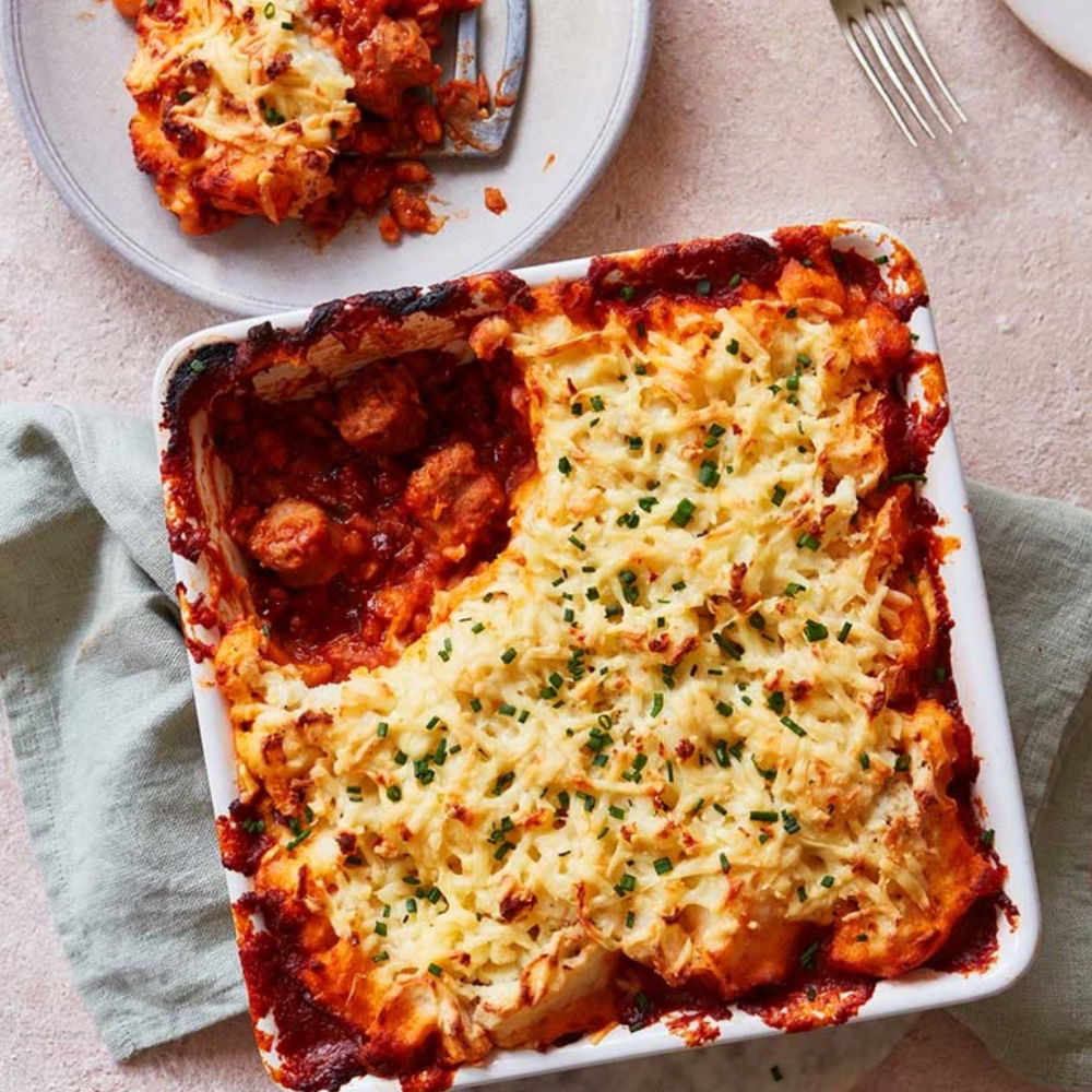 Indulge in a classic comfort food dish with this simple recipe for cowboy pie, featuring sausages, baked beans, and a crispy mashed potato topping.